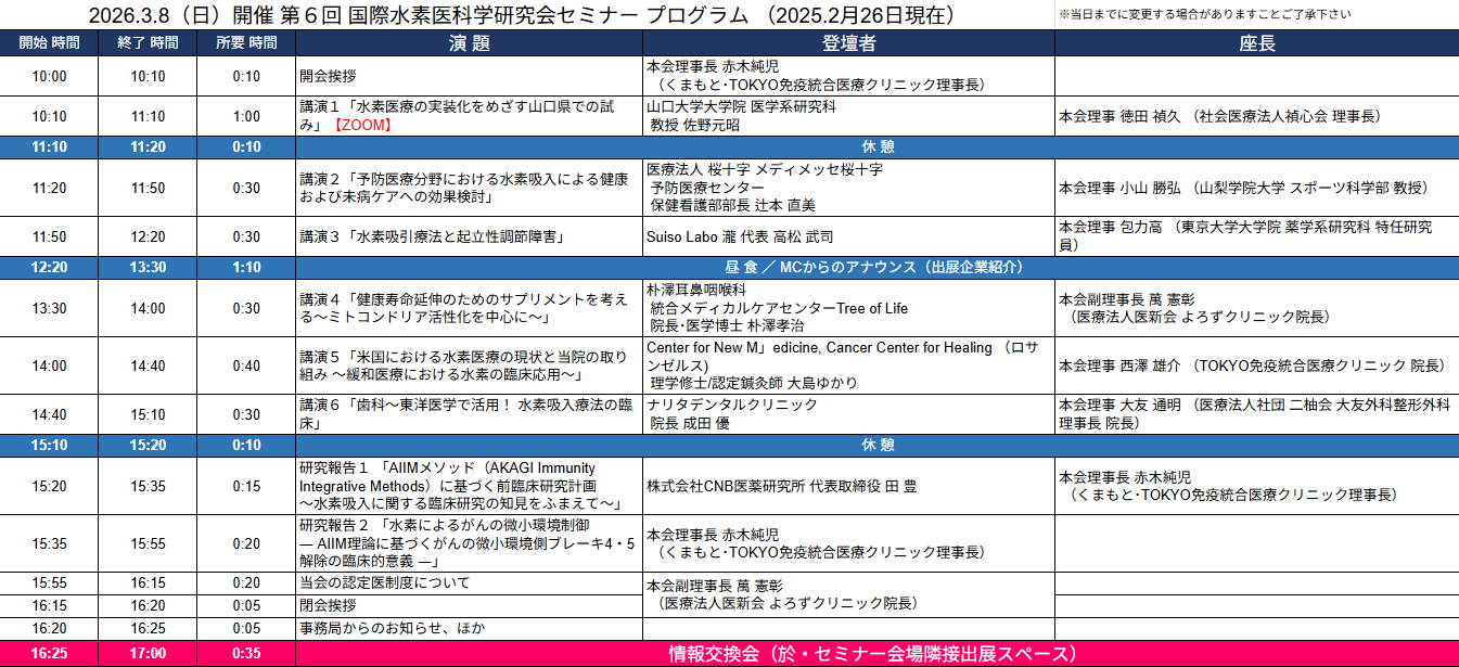 2026.3.8(日)開催 第6回 国際水素医科学研究会セミナー プログラム (2026.2月現在)